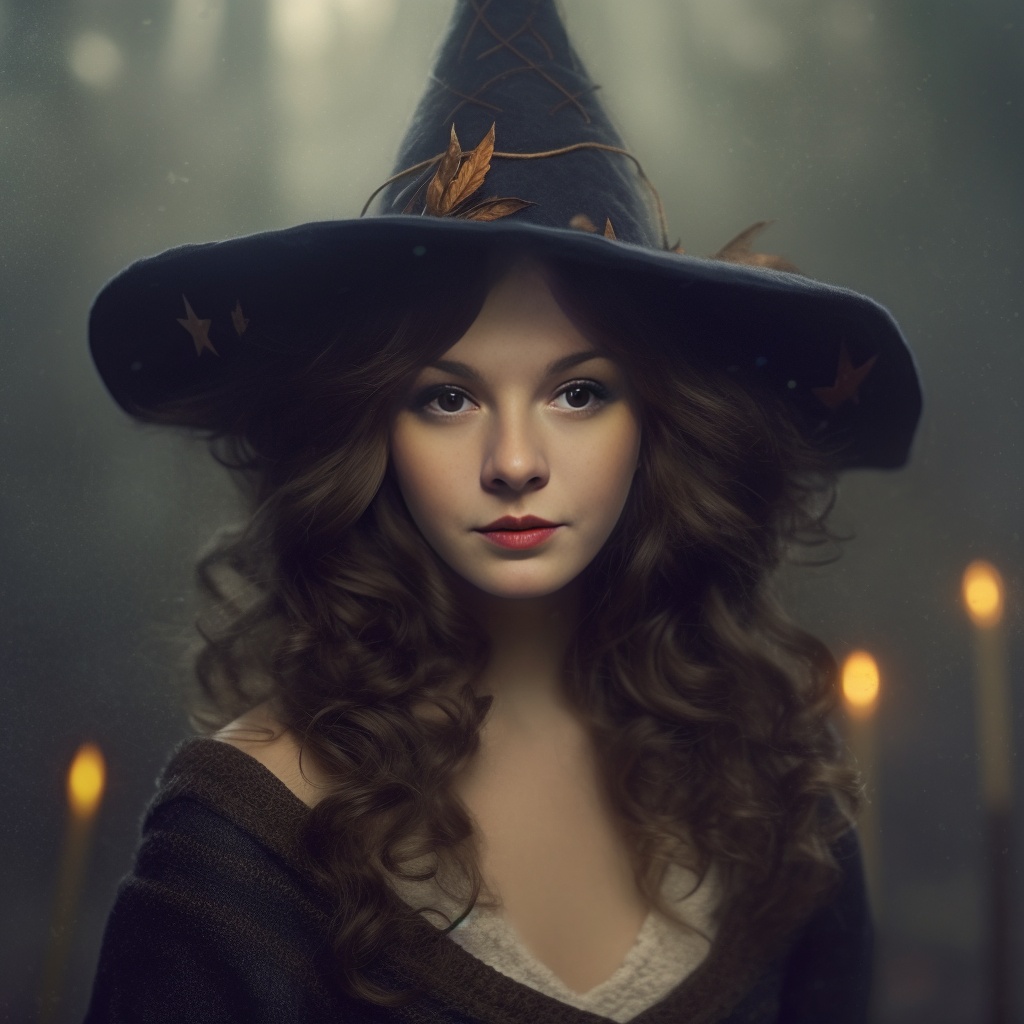 Veronica gazed at her reflection, a small smile playing on her lips as she adjusted the wide-brimmed witch’s hat adorned with delicate leaves and twine. The costume was perfect, an enchanting combination of classic elegance and subtle mystique that made her feel effortlessly magical. Dark curls framed her face, adding to the otherworldly charm, while the flicker of candlelight in the background cast soft shadows that completed the bewitching look. Tonight, she would attend her first costume party as herself, stepping into a role that felt like it had always been waiting for her.